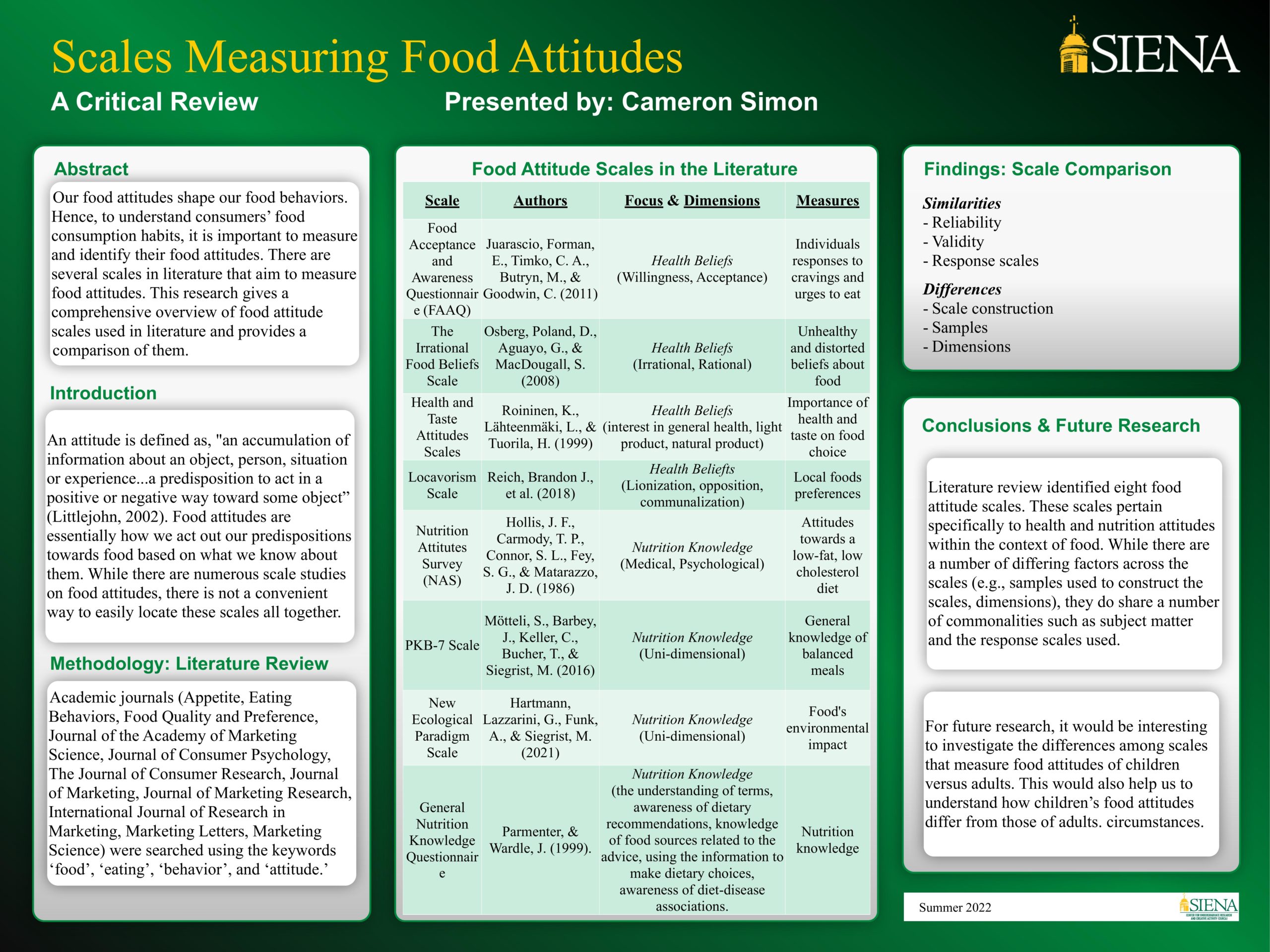 Over the summer, we have been compiling food scales that will ultimately be collectively organized into a published book. My poster will focus on one of the chapters in the book. The chapter is called Food Attitudes and Involvement. My poster will obtain an overview summarizing some of the general trends in the variety of scales we collected along with some summarization of the general processes that went into creating the scales and lastly a discussion of our findings. The presentation of all this information will also be aided by a few visual elements, namely various charts and graphs.