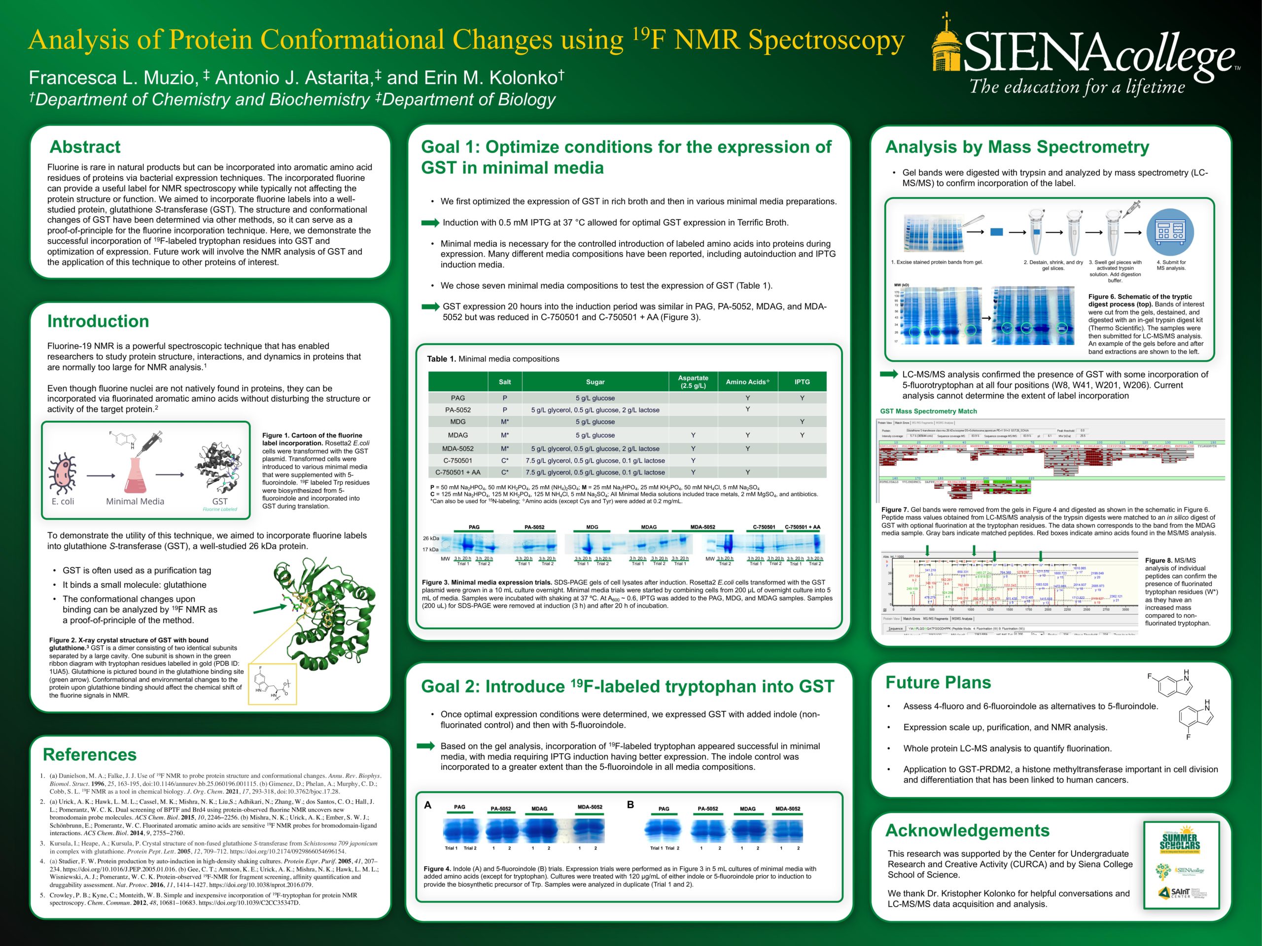 Fluorine is rare in natural products but can be incorporated into aromatic amino acid residues of proteins via bacterial expression techniques. The incorporated fluorine can provide a useful label for NMR spectroscopy while typically not affecting the protein structure or function. We aimed to incorporate fluorine labels into a well-studied protein, glutathione S-transferase (GST). The structure and conformational changes of GST have been determined via other methods, so it can serve as a proof-of-principle for the fluorine incorporation technique. Here, we demonstrate the successful incorporation of 19F-labeled tryptophan residues into GST and optimization of expression. Future work will involve the NMR analysis of GST and the application of this technique to other proteins of interest.